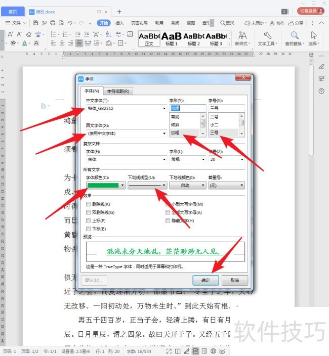 3、 选中文档中的部分文字,设置不同的字体、颜色、下划线等。