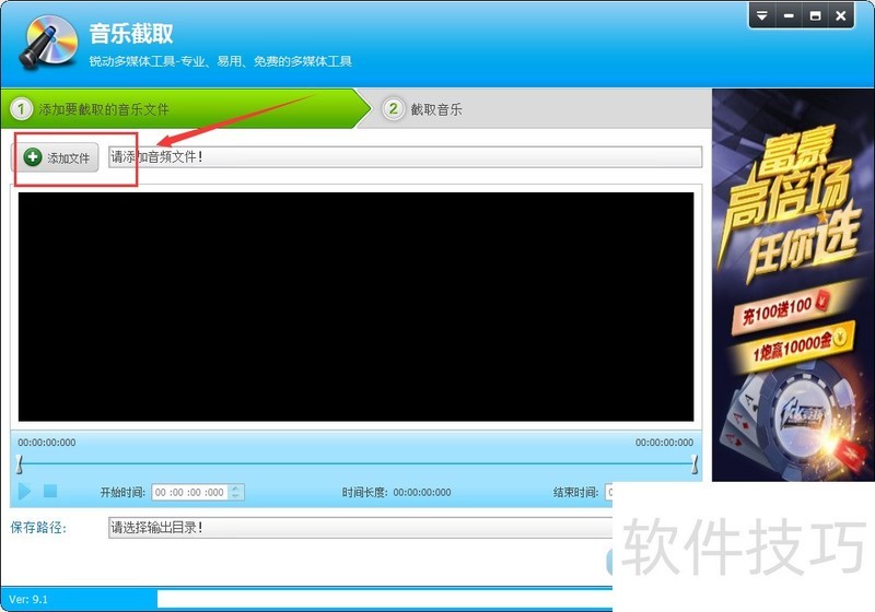 2、 打开音乐截取后,然后选择-添加文件,将准备的音频文件添加到软件工具中