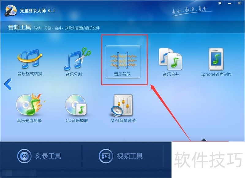 1、 打开光盘刻录大师软件,选择音频工具-音乐截取