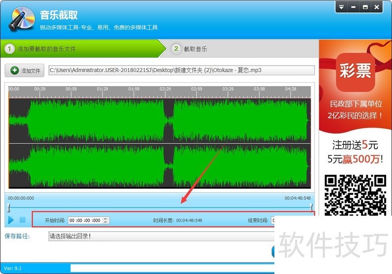 3、 在音乐截取中,通过调节开始时间和结束时间,来截取中间的音乐