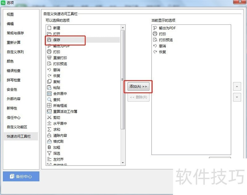 5、 在左边的选项里面选中【保存】,点击中间的【添加】