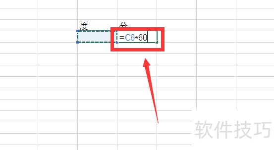 2、 根据尝试,1度等于60分,因此在“分”下方单元格输入“=C6*60”,C6为“度”下方单元格位置。