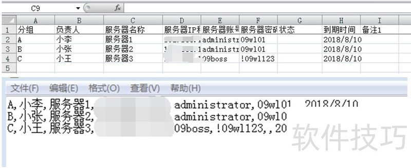 3、 ⒂胑xcel整理需要远程的服务器信息(格式如下图),粘贴到txt保存好,每个信息之间用英文“,”隔开: