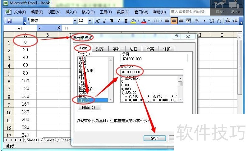 3、 第二步:选择“数值”--“自定义”--“类型”中输入K0+000.000--“确定”