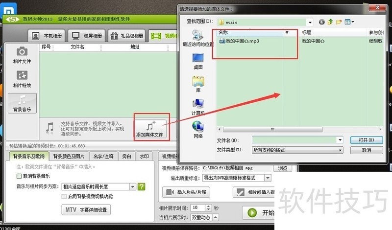 3、 打开了请选择要添加的媒体文件对话框中找到“要添加的背景音乐文件并双击”