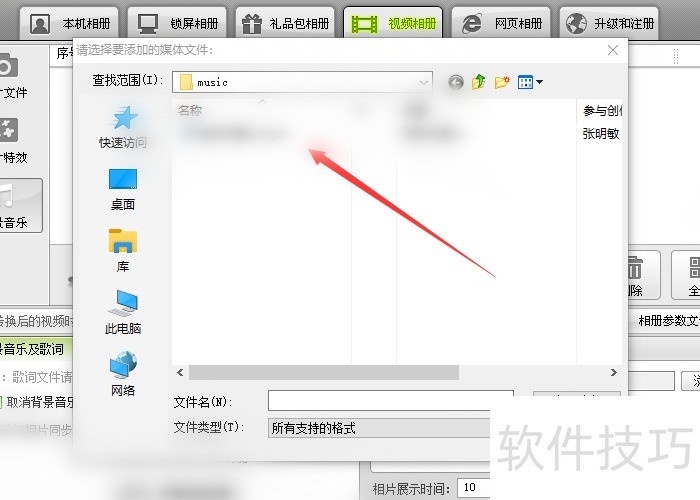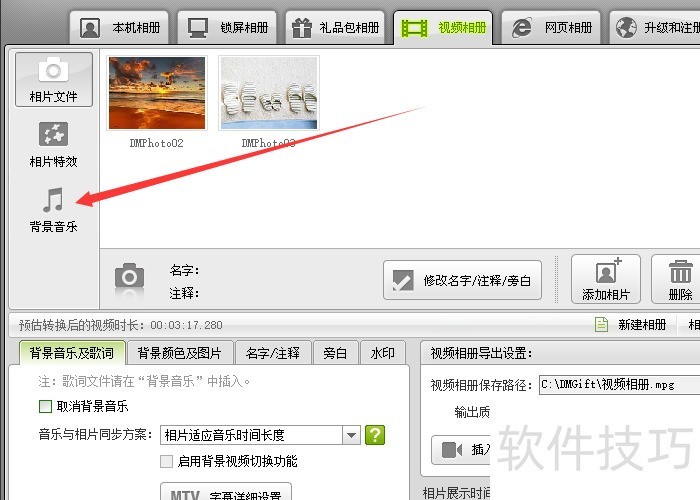 3、 点击选择视频相册并导入我们想要制作的图片。然后点击“背景音乐”——“添加媒体文件”4选择合适的音乐作为我们整个视频的背景音乐
