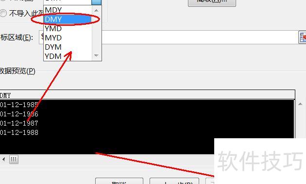 第三步:在分列向导中选择日期,设定格式为DMY,点击完成即可。