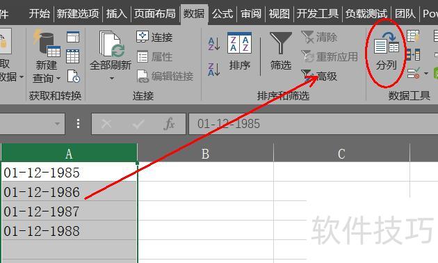 打开目标Excel文件,选中单元格,点击数据选项卡中的分列功能。