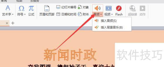 点击插入后,下方会显示多个工具选项,选择音频并单击,从下拉菜单中选取插入背景音乐,点击即可打开。