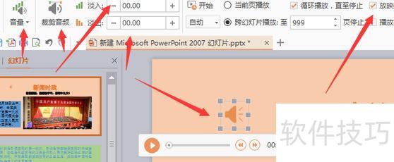 选择音频后,PPT页面会出现小喇叭图标,可拖动至空白区域或保持原位,放映时可选择隐藏。支持裁剪音频片段、调节音量,还可设置仅在指定幻灯片页面播放音频。