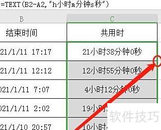 选中C2单元格,输入公式:=TEXT(B2-A2,h小时m分钟s秒),然后按下回车键确认。