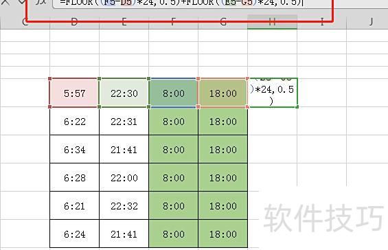在H列输入公式=FLOOR((F5-D5)*24,0.5)+FLOOR((E5-G5)*24,0.5),用于计算总加班时长。其中,FLOOR((F5-D5)*24,0.5)表示早于8点开始工作的加班时间,按半小时取整;FLOOR((E5-G5)*24,0.5)表示晚于18点下班的加班时间,同样以半小时为最小单位进行向下取整,两项相加得出当日总加班小时数。