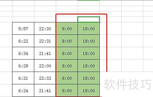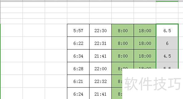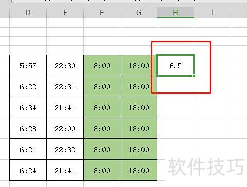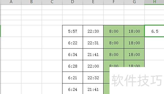 由于上班时间为早上8点,下班时间为下午6点(即18点),因此在上班和下班时间两列后新增两列:F列为标准上班时间8:00,G列为标准下班时间18:00。