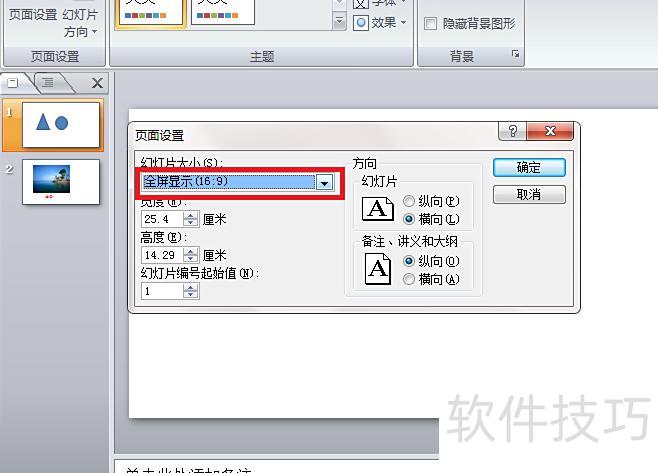 在页面设置对话框中选择幻灯片大小为全屏(16:9),确认后退出。