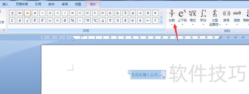4.04 此时 Word 中弹出公式输入框,菜单栏切换为公式符号界面,点击结构中的分数选项即可。