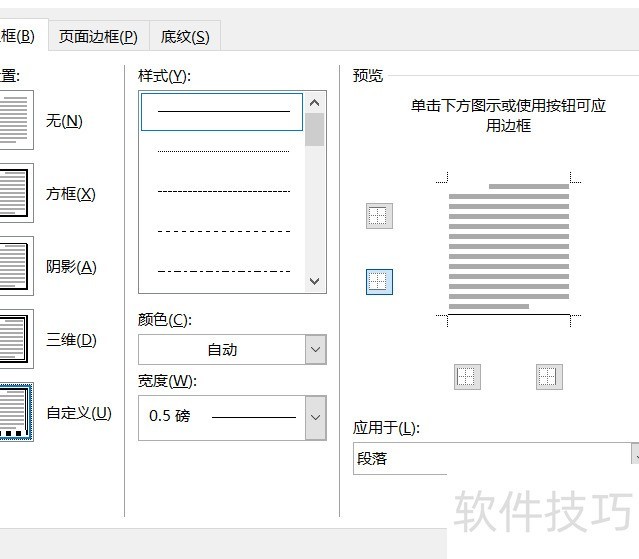 在边框和底纹对话框里,可自定义下划线的样式、颜色与粗细,设置完毕后点击即可。