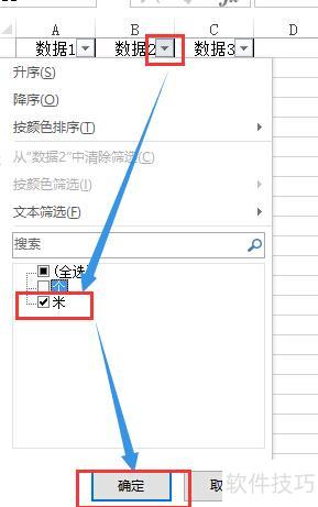 选中数据区域首行,点击数据选项卡中的筛选功能,点击条件列的下拉箭头,选择所需条件,如选择数据2为米的行,即可完成筛选。