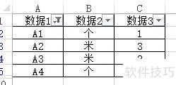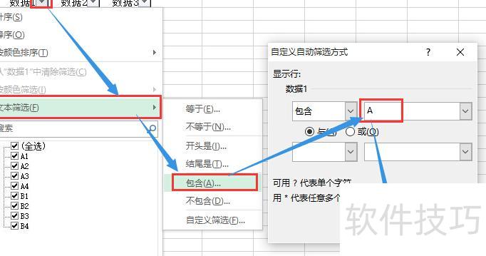 例如,筛选数据1中包含A的行:点击数据1下拉箭头,选择文本筛选,输入A,点击确定即可。