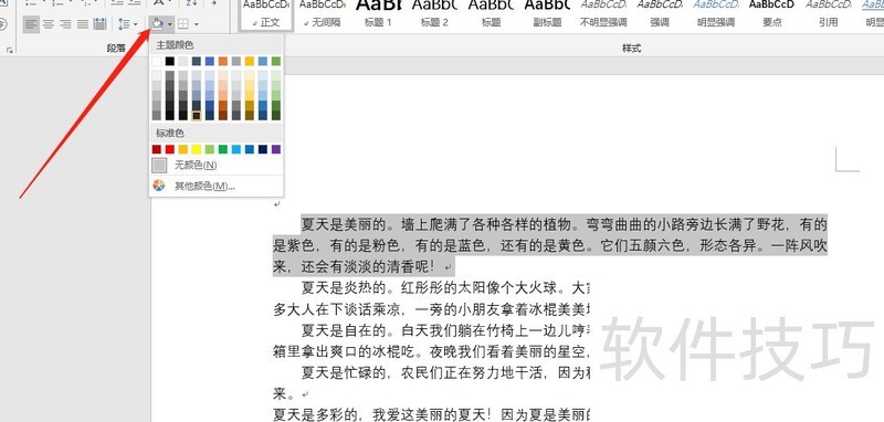 选中段落,点击颜色填充桶,在弹出窗口中选择所需颜色,即可为段落添加背景色。