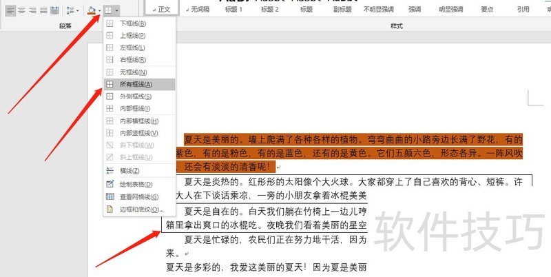6.4 为段落设置边框样式时,可选择上边框、下边框等。先选中文字,点击边框图标进行设置。此外,还可对段落进行特殊格式调整,如设置段前、段后间距。