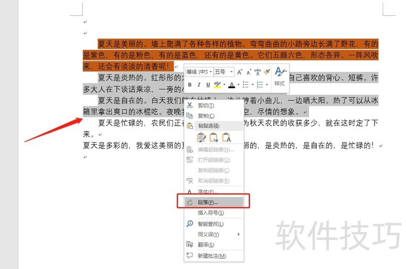 先选中文字,右键点击选择段落,在弹出的设置中调整首行缩进字符数量即可完成设置。