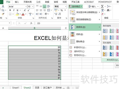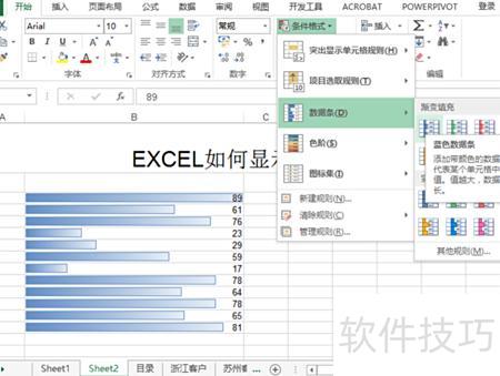 点击数据条后会弹出一个新菜单,所示,包含渐变填充和实心填充两个选项,下方排列着多个横向条形格子,这些即为今日所使用的数据条,两个标题含义可按字面理解即可。