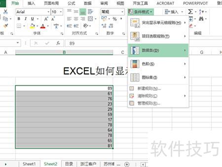 首先选中所需数值,进入插入选项卡,点击条件格式,在下拉菜单中选择数据条功能即可完成设置。