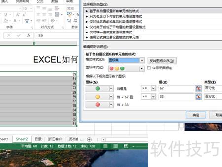 完成上述操作后,各单元格将按条件显示不同颜色的圆点,此时再添加渐变填充中的蓝色数据条,可进一步增强视觉效果。