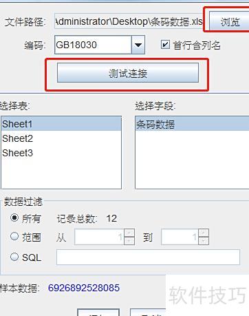若Excel表格包含列名,需勾选首行含列名前的复选框,否则无需勾选。点击测试连接后,系统将加载表格中的全部数据。如不需打印所有数据,仅需输出部分记录,可在数据过滤-范围中设定起始与结束条目编号,或通过编写SQL语句进行筛选。具体设置方法可参考相关条码标签打印软件的操作指南,了解如何选择并打印数据库中指定范围的数据内容。