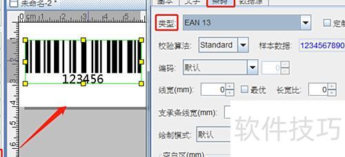 点击软件左侧条形码按钮,在画布上绘制条形码,双击后于图形属性中将条码类型设为EAN13。