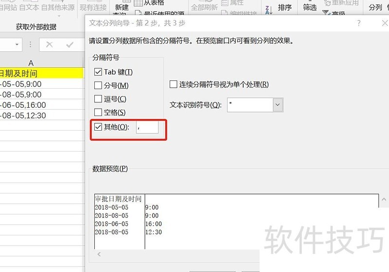2. 启动文本分列向导,选择其他并在空白处输入逗号,点击下一步完成;若以空格分隔,则直接勾选空格。