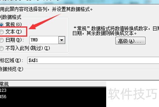 6、点击下一步,进入文本分列向导第三步,选择列数据格式中的文本选项,所示。