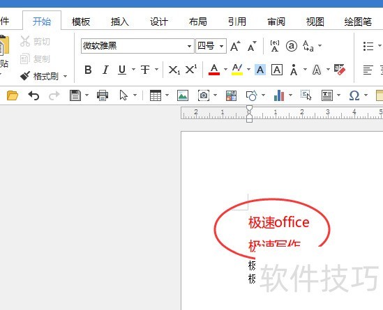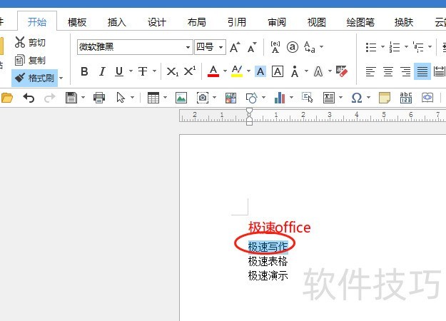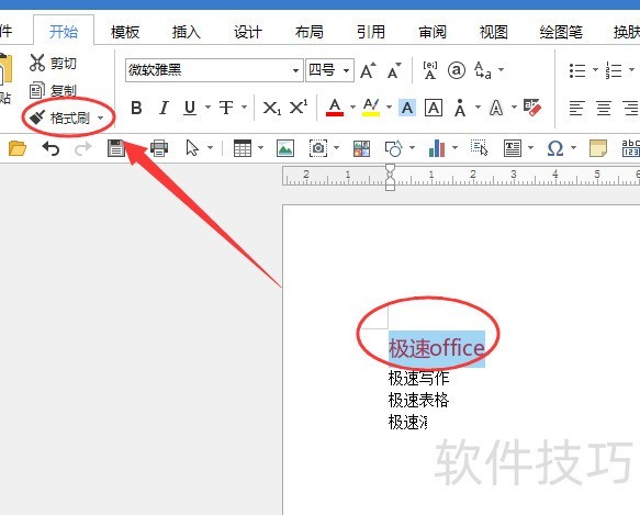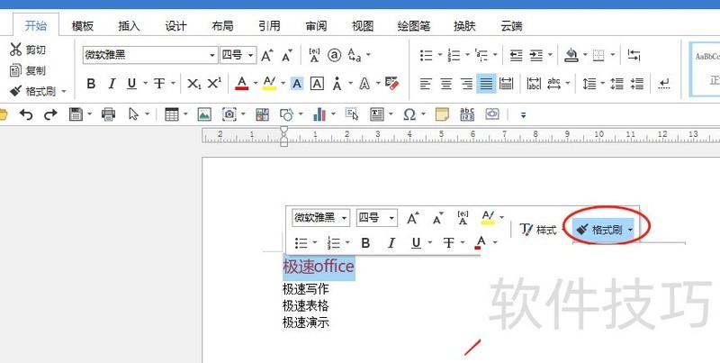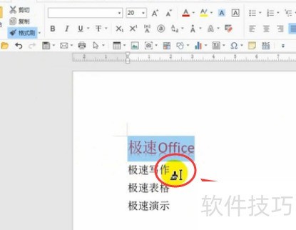 所示,先选中极速office,然后点击开始工具栏中的格式刷,或在选中后上方出现的快捷菜单中选择格式抹,此时鼠标光标将变为小刷子图标。接着选中极速写作并松开鼠标,其文字的字体颜色和字号便会自动调整为与极速office一致,实现格式快速复制。