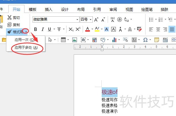 选中极速office后,点击开始菜单中格式刷下拉按钮,选择应用于多处,随后依次点击极速写作和极速表格,其格式将同步更改。完成操作后,再次点击工具栏上的格式刷按钮,即可退出格式刷模式,鼠标光标上的小刷子图标随之消失,恢复为正常编辑状态。格式刷呈蓝色表示启用,单击即可关闭。