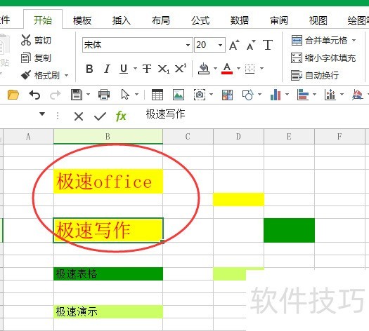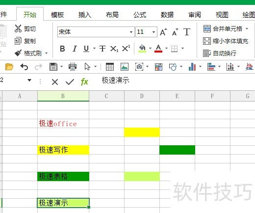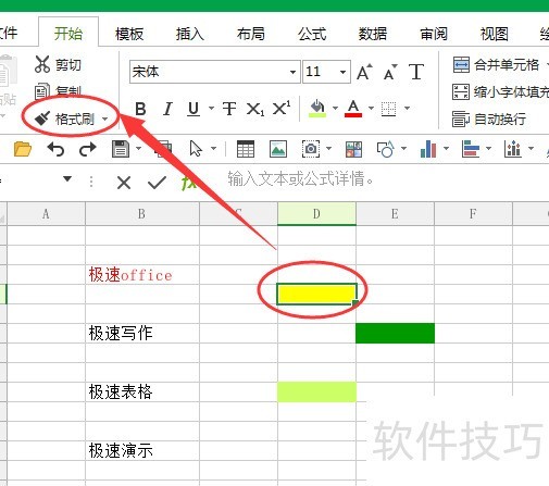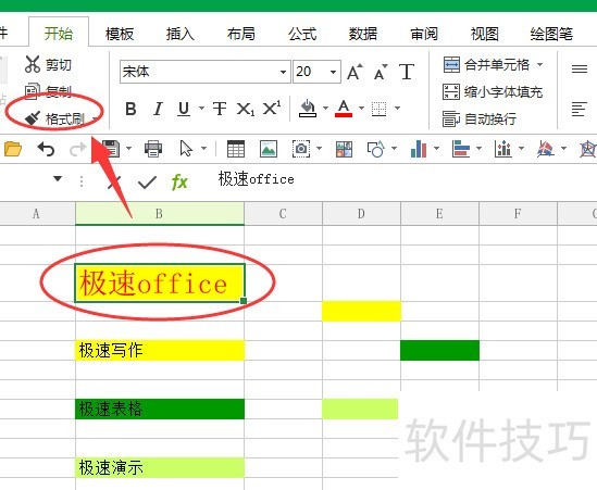 修改背景色后,可继续调整字体颜色或字号;例如将极速office的字体和颜色设置完成后,点击工具栏的格式刷,再选中极速写作单元格,其格式便会同步更新。