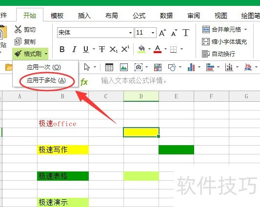 先选中一个黄色背景的单元格,点击开始菜单中的格式刷,鼠标指针会变成小刷子图标,再单击极速写作单元格,其背景色即变为黄色;其他单元格也可依此操作修改背景色。若需重复使用同一格式,可点击格式刷下拉按钮选择应用于多次,之后连续刷取多个单元格即可。