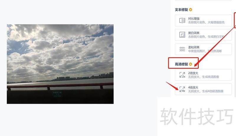 进入照片编辑界面后,点击右侧修复选项中的高清修复,根据需要选择2倍或4倍无损放大功能,直接确认即可完成操作。
