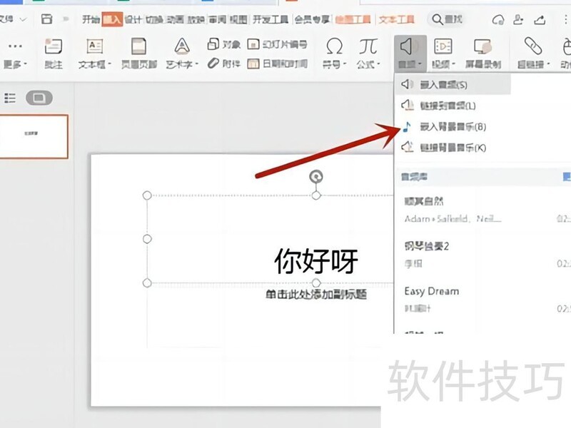 点击音频下拉菜单,选择并嵌入背景音乐。