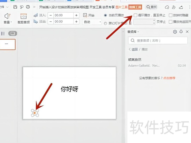 点击音频图标,取消循环播放后直接删除该图标。