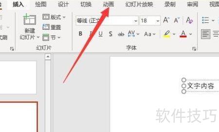 通过为同一幻灯片中的各个元素分别添加动画效果,可实现内容逐个出现,具体操作步骤如下。