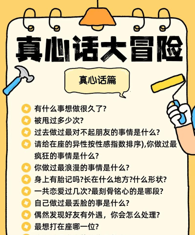 真心话大冒险游戏真心话问题涵盖个人经历和秘密,如初吻年龄、初恋对象等,通过提问增加趣味性和互动性。