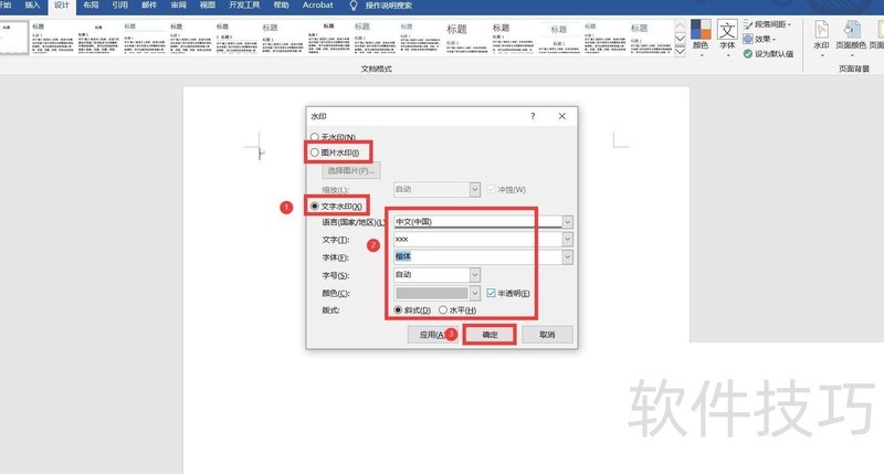 6.4. 选择所需水印样式,此处选文字水印,随后设置语言、内容、字体及大小,确认后即可完成应用。