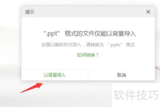 将待格式化的PPT课件导入后,会提示只能以背景形式导入,无法修改。此时需将课件从低版本转换为高版本格式。