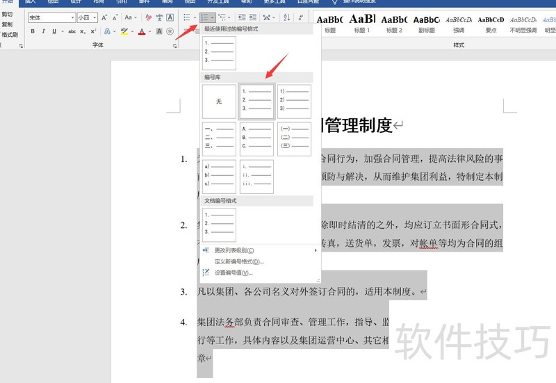 若要更改编号样式,只需选中内容,点击编号,选择所需样式即可。