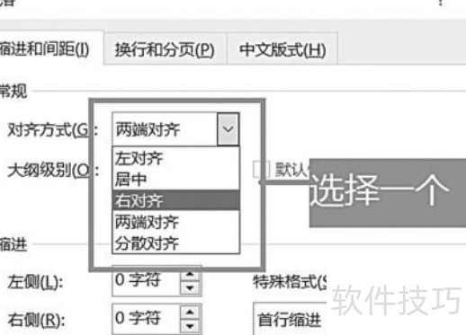 单击选项卡中组右下角的下拉箭头,或使用鼠标右键选择对话框,在下的区域中,点击并选取所需对齐格式即可完成设置。