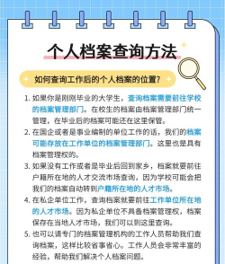 个人档案查询流程包括准备材料、联系相关机构、提交申请等步骤,部分地方提供节假日预约查档和延时服务,方便特殊群体。