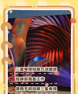 三星电视投屏步骤包括确保设备在同一网络,打开投屏软件或功能,搜索并选择电视设备,完成连接以享受大屏幕娱乐体验。