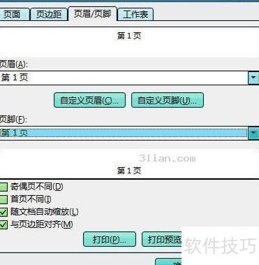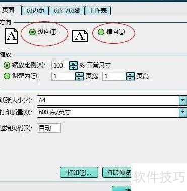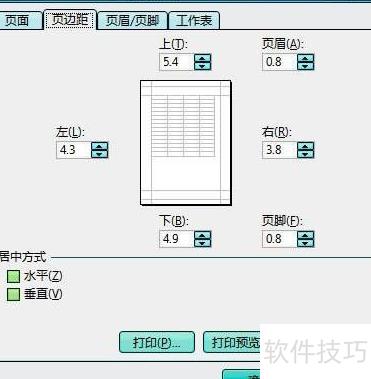 在弹出的窗口中点击页面设置,可见四个选项卡:页面、页边距、页眉/页脚和工作表。它们分别用于调整页面布局、设置页边距、添加页眉与页脚,以及配置工作表打印的高级选项(其中工作表选项较复杂,初学者较少使用)。熟悉整体结构后,建议读者逐一尝试各选项的实际操作,以加深理解并掌握打印设置的基本功能。