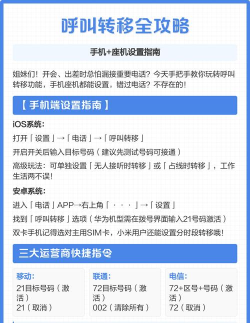 手机呼叫转移设置方法包括通过电话拨号盘输入特定代码,如无条件转移输入*21号码#,或通过运营商APP进行设置,确保来电转移到指定号码。