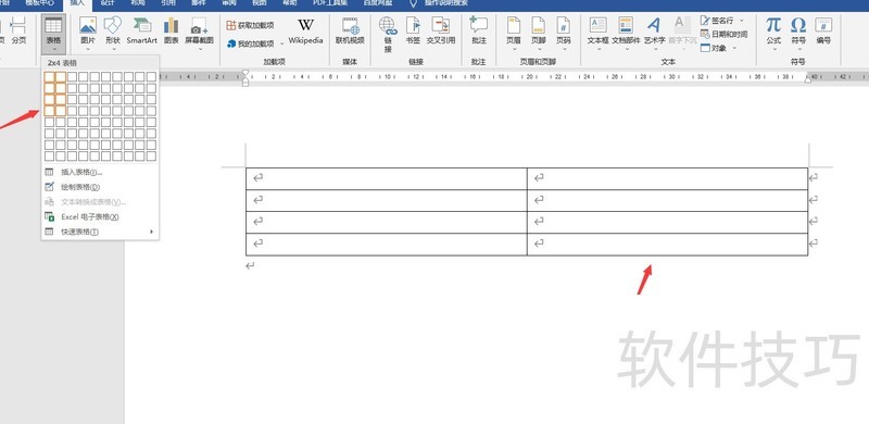 我们点击插入,选择表格,框选生成一个2行4列的表格。